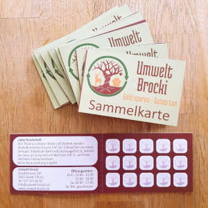 Ihre Treue soll belohnt werden, darum gibt es unsere Sammelkarte. Ab einem Einkauf von CHF 10.- gibt es einen Stempel, ist die Karte voll, gilt sie, mit ausgefüllter Rückseite, als Gutschein für den nächsten Einkauf im Wert von CHF 5,-.